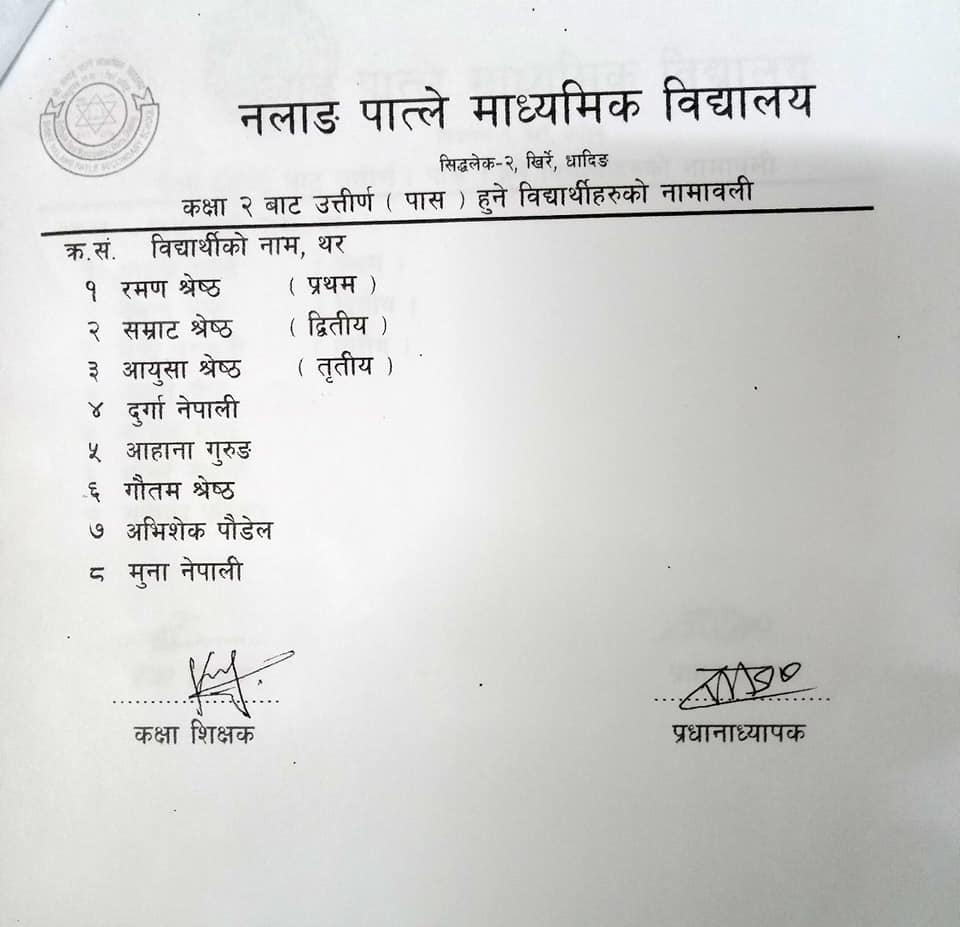 कक्षा २ बाट उतिर्ण हुने बिधार्थीहरुको नामावली